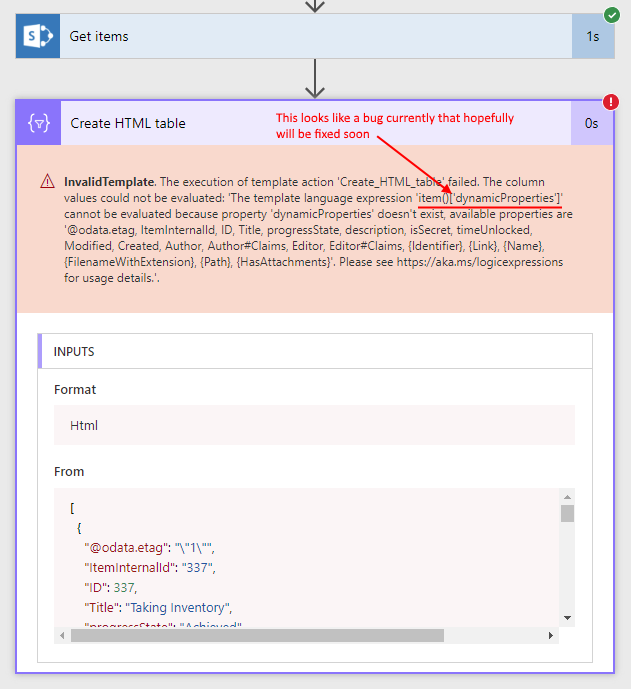 "Select": { "type": "Select", "inputs": { "from": "@body('Get_items')?['value']", "select": { "Title": "@item()?['Title']", "State": "@item()?['progressState']", "Unlocked": "@formatDateTime(item()?['timeUnlocked'], 'yyyy-MM-dd')" } } }, "Create_HTML_table_2": { "runAfter": { "Select": [ "Succeeded" ] }, "type": "Table", "inputs": { "from": "@body('Select')", "format": "HTML" } }