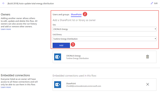 Flows can have multiple owners, but it can also have a Resource as a owner. The best example of this is in SharePoint connector. A Flow can be ‘owned’ by the List or Library resource - so if we grant a user library owner permissions - that user automatically can see and modify the Flows owned by the resource. This is awesome because we don’t need to manage two sets of user ownership sets.