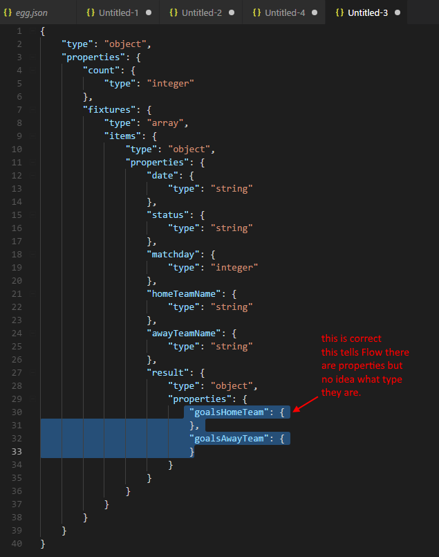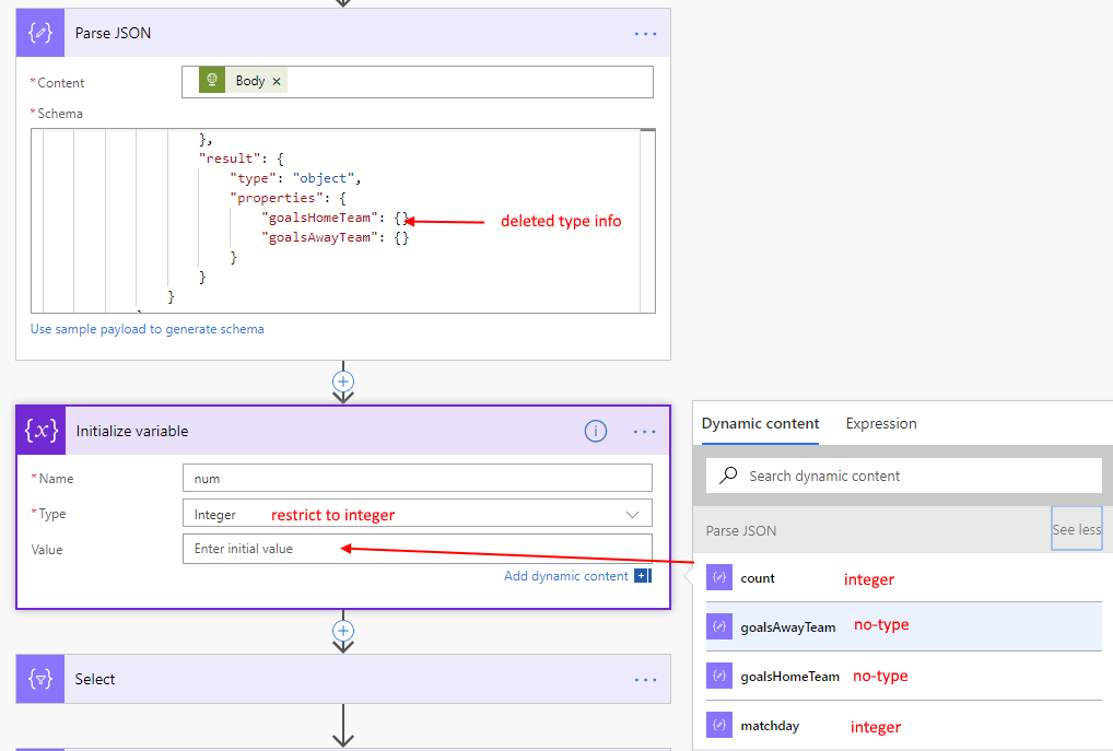 In general, Parse JSON generates the schema based on the first object it sees from the sample. This is not always correct - since sometimes the properties may be null in the later objects. For example in the football games data - earlier records has scores as integers, but later records haven’t been played yet so scores are null.