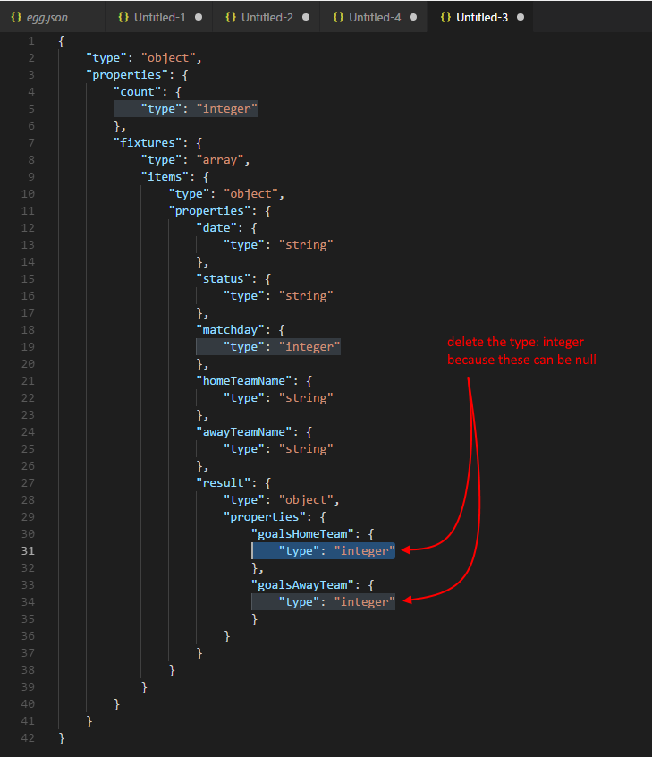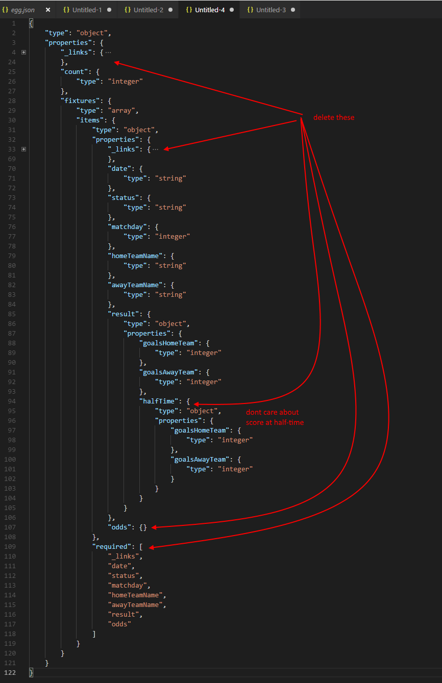 We see it has generated type information for various _links properties, or in this example, the halfTime results or odds of a football game. We don’t need this, so we can delete it from the schema.