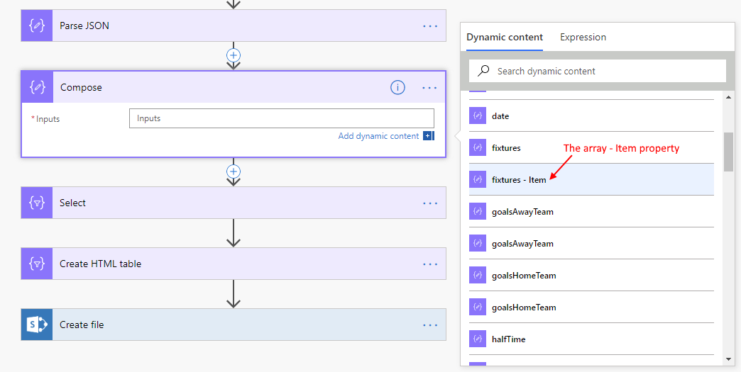 Notice under the fixtures (array) we have an items property with each object. This appears under Dynamic Content Panel as “fixtures - Item”
