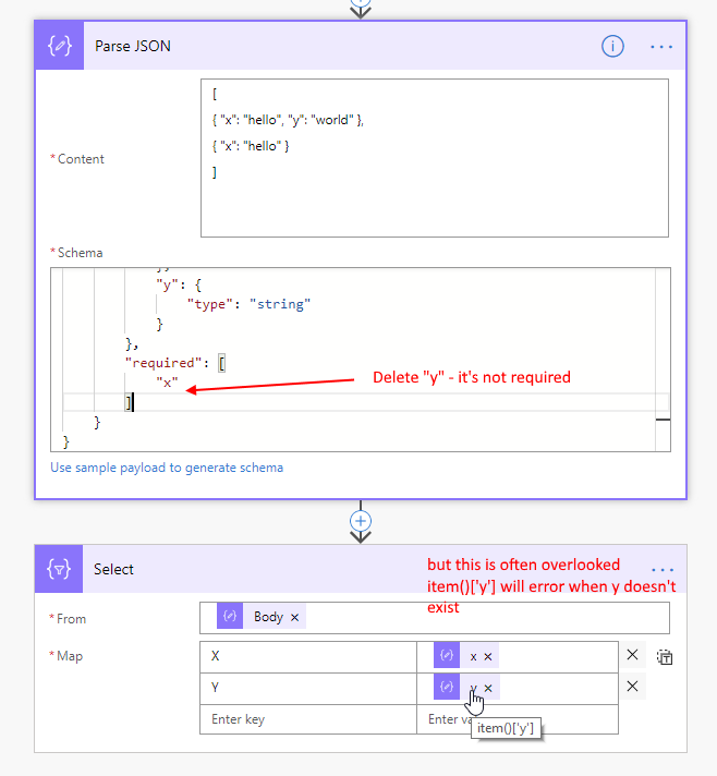 It is up to each scenario to decide if there’s value to fix the JSON Schema, or to skip using Parse JSON and just use item()?[‘property-name’] expressions directly.