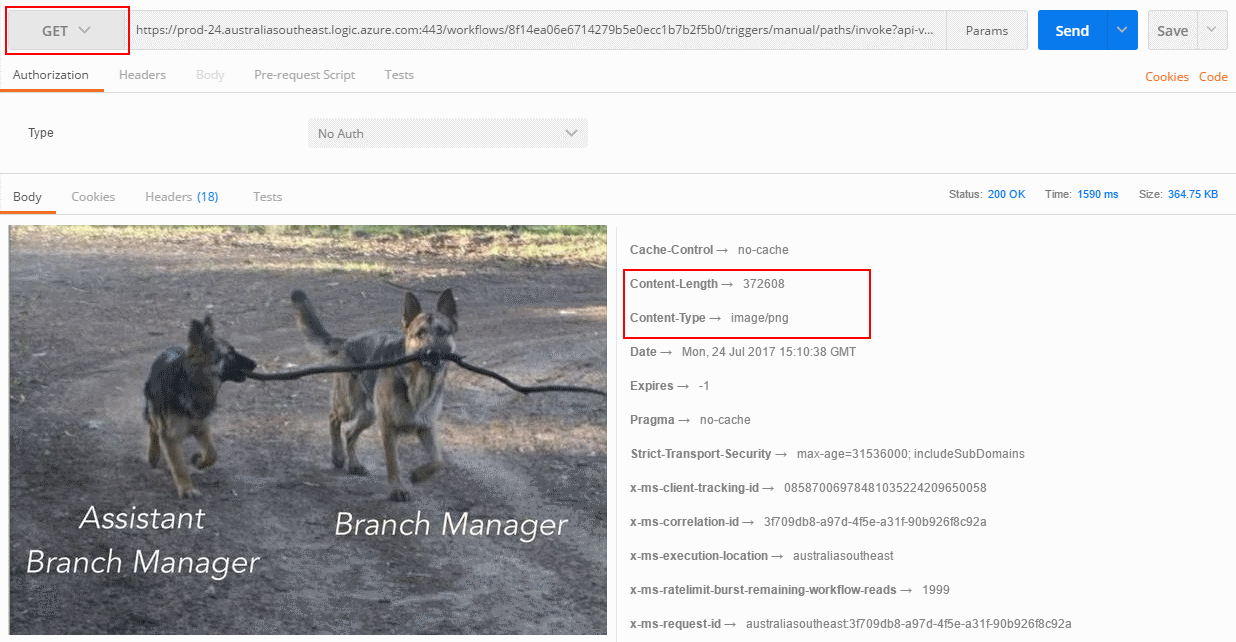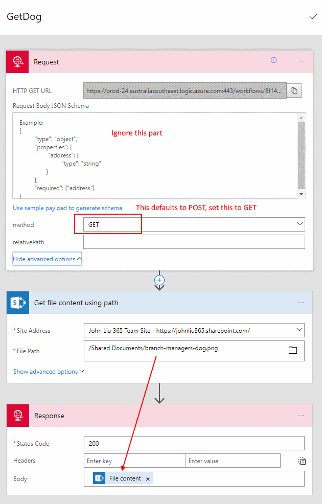 The method needs to be set to GET. Take a image that’s authenticated in SharePoint, and set that to be the response output.