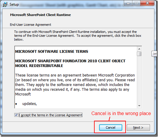 Figure: installing the redistributable. Note the Cancel button is where you expect Next to be :-(