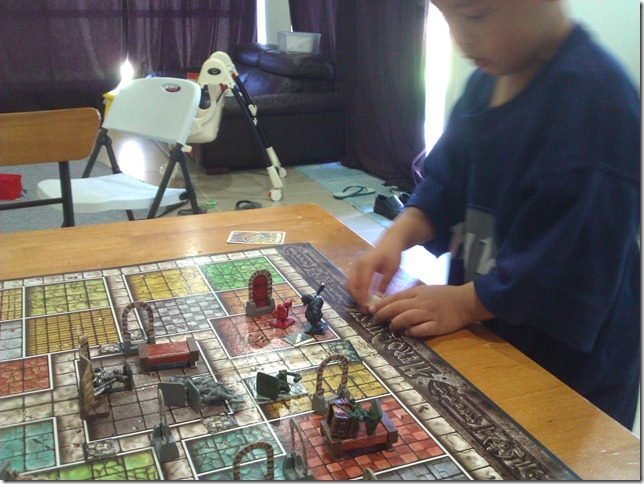 He is three. He is playing his dwarf hero here, trying to cheat the dice roll because he knows he needs to get “skulls” on the dice to hit the Ogre. Along the way, he has already fought off: