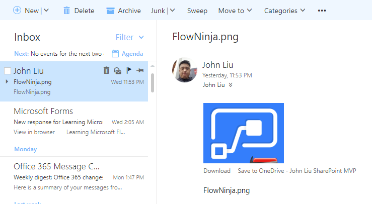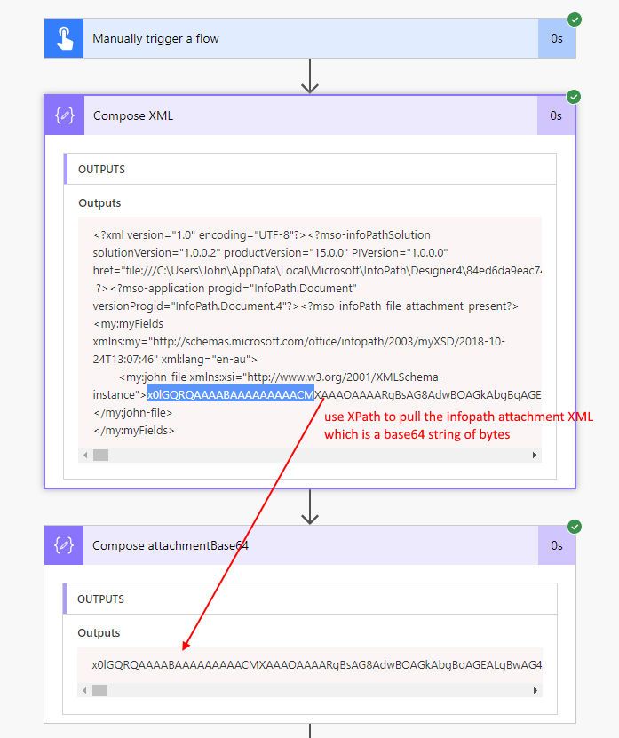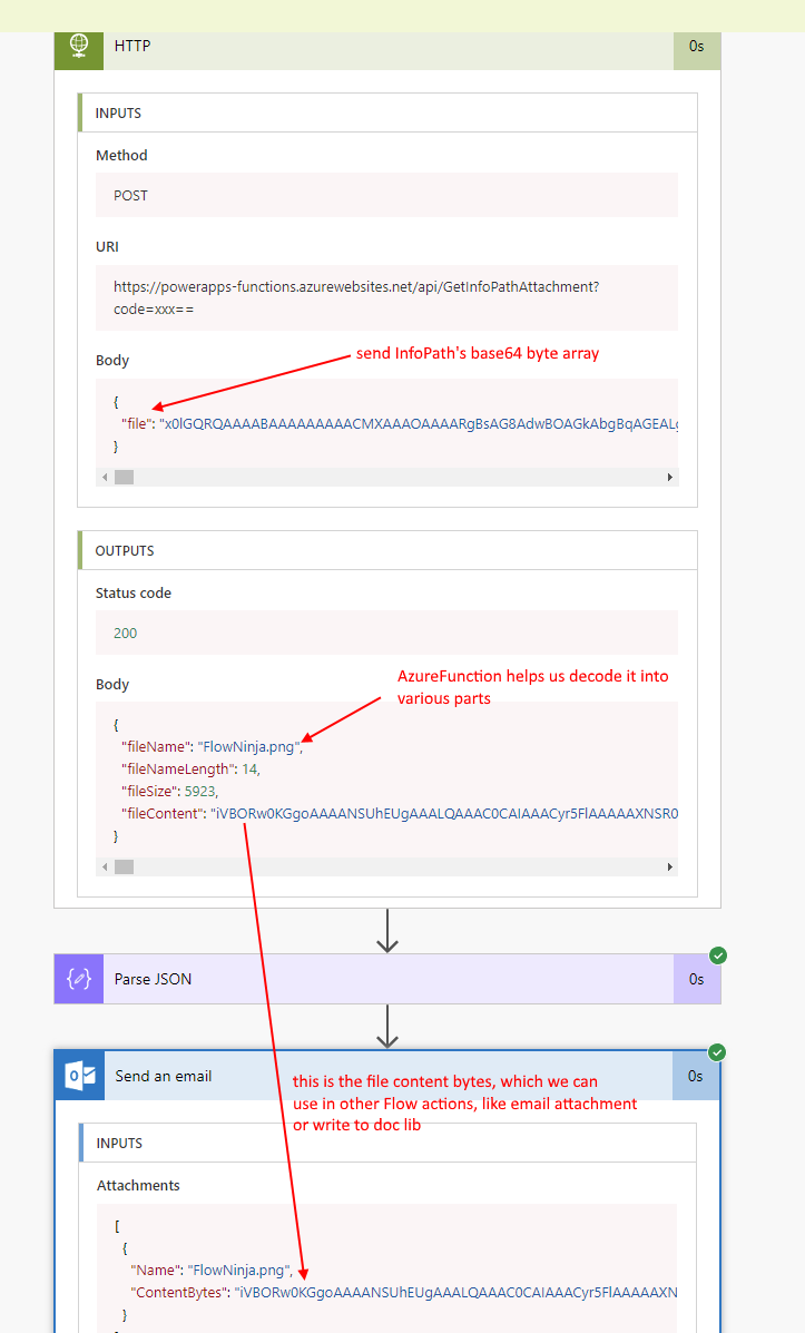 This is a problem I tried to tackle before, but came to realization that I would need an AzureFunction. The main reason is that the InfoPath attachment is a base 64 byte array but the byte array has a variable length header that includes the attachment file name. Flow doesn’t have amazing byte manipulation or left-shift abilities. So we need to write an AzureFunction to help.
