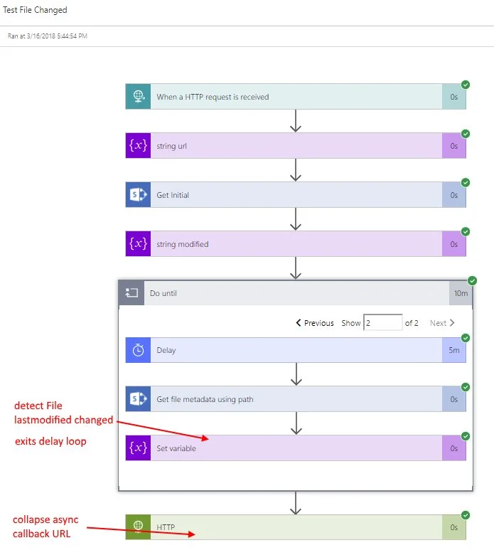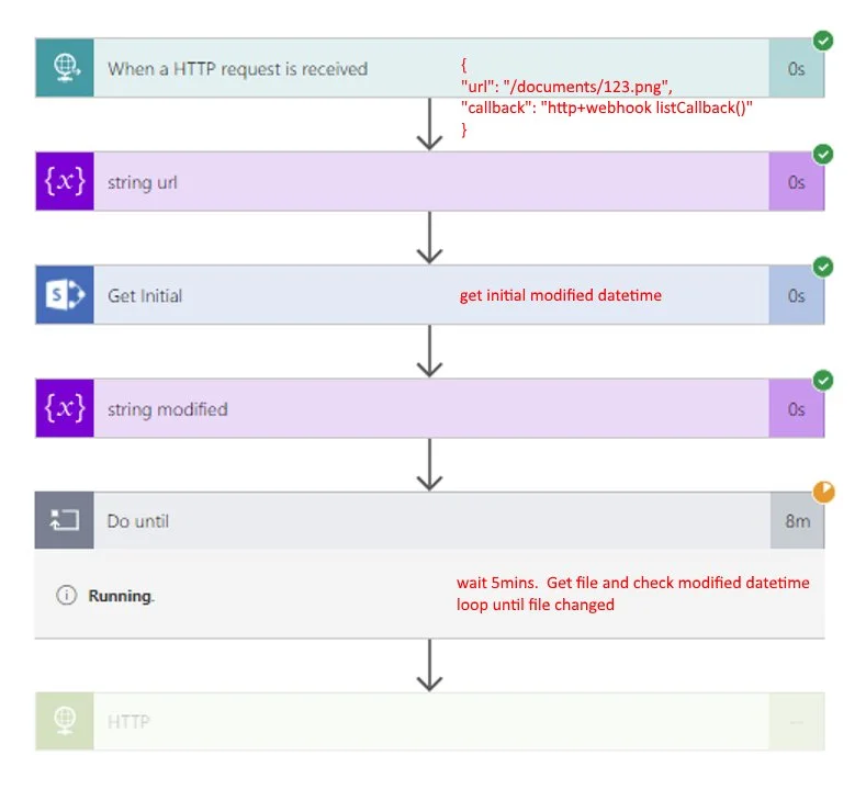 Next, enter a do-until loop, and delay every 5 minutes and then grab the file’s metadata again and check if the modified time has changed. When it has changed, we exit the do-util loop, and call the original callback url with a plain HTTP action.