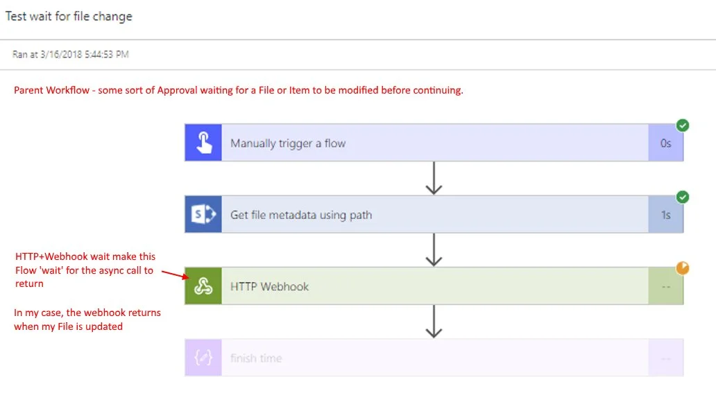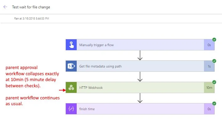 See the parent “waiting” action completes in some time in the future. In my example, it was 10minutes. But in real world this can be days or weeks. Flow’s timeout is 30 days. So we can build quite complex, long-waiting, asynchronous processes.