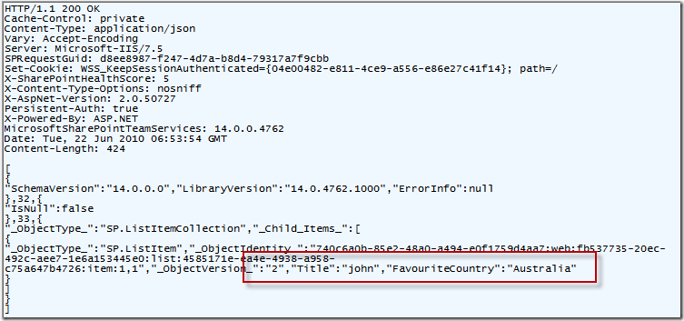 The returned JSON object is a lot lighter - and contains only a few of the required fields (ID, ObjectType, ObjectVersion), as well as our Title and FavouriteCountry.