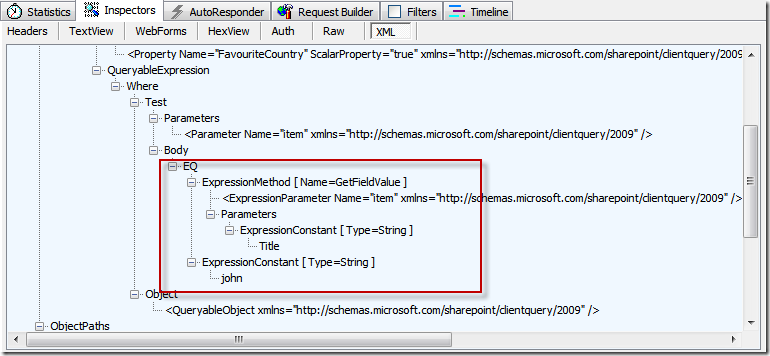 Check out the Request XML - includes the Where clause filter.