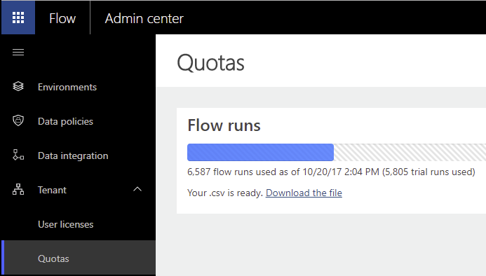 So, I’m looking around Flow Admin center. I see a tab Quotas. I clicked on it and sees oh it’s got a bar telling me how many runs left. That’s good.