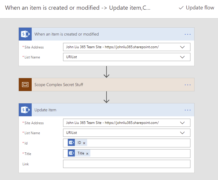 This one is can be in different forms. But the idea is simple - you trigger from a SharePoint list item, and you update that same item.