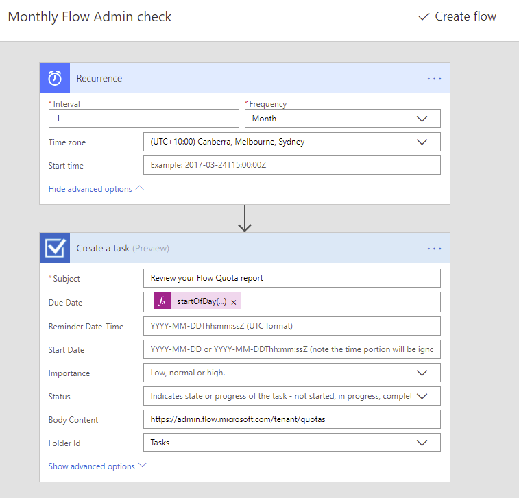 We create a new recurring monthly Flow that creates a TODO task to review the Flow Admin Quotas.
