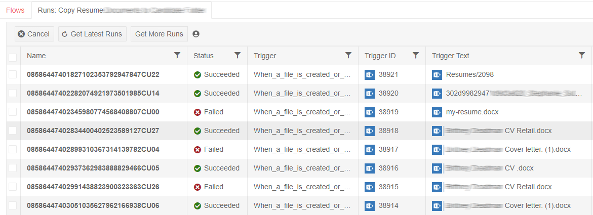 Clicking on Sparklines takes me right into the latest set of Flow runs - many of them have failed. Flow Studio understands the trigger data (SharePoint, Dynamics or CDS) and brings the context of each trigger to the front. We don’t see just random Run IDs - instead we see the trigger item id, title or filename. These to help makers select the correct runs to re-submit.