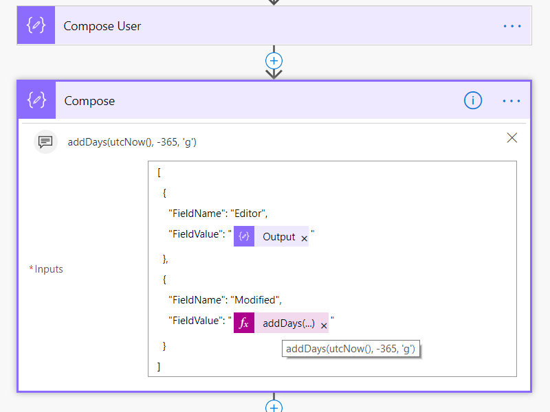 Here is an example of using addDays(utcNow(), -365, ‘g’)
