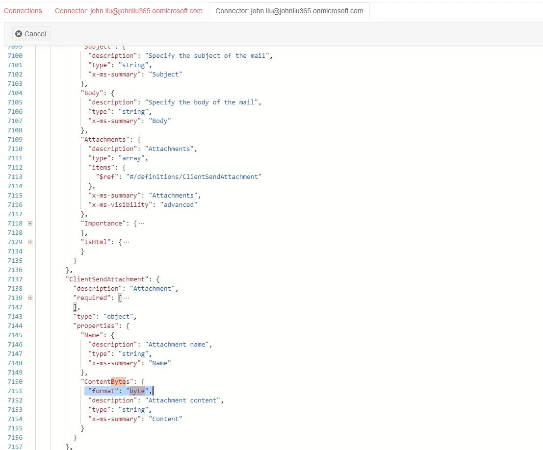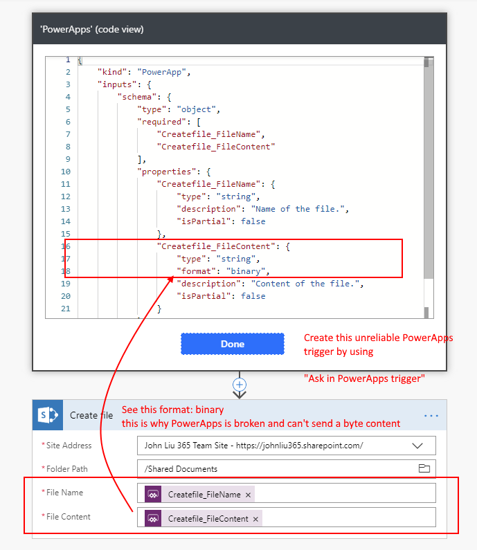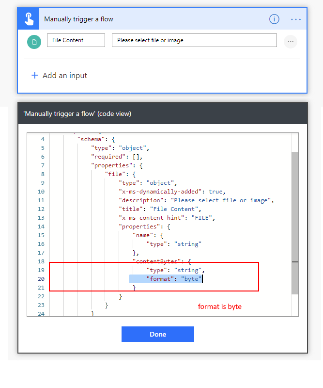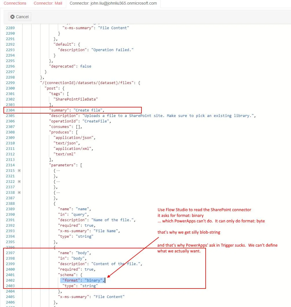 We lock the PowerApps trigger to format: byte by using an otherwise unused Outlook send mail connector.
