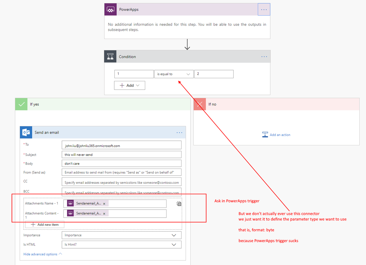 We need to keep the unused Send an email action even if we don’t use it - because it locks the PowerApps trigger in place so the trigger doesn’t reset.