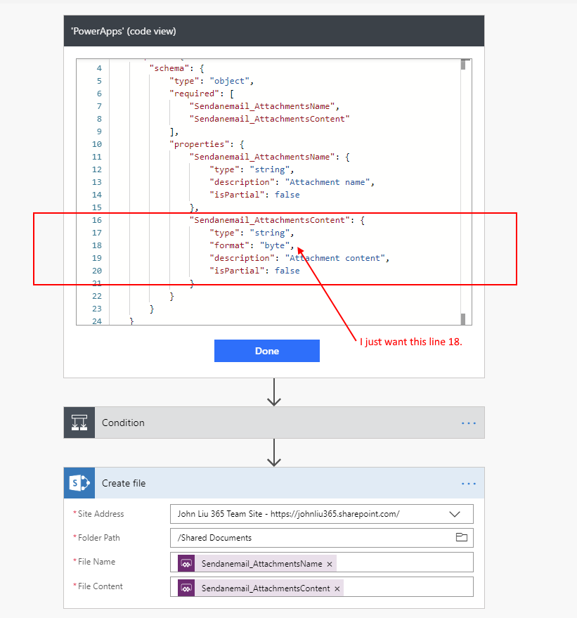 The argument sendanemail_attachmentscontent is ugly. Try using Flow Studio to rename them first before you go too far. This will also make the connection tidier when you take it over to PowerApps.