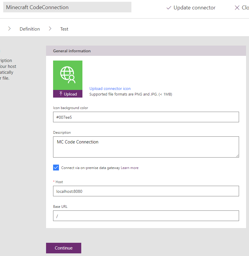 Note the custom connection swagger file points to localhost:8080 - this will work if your data gateway is on the same machine as the Code Connection exe. Otherwise, you should use the LAN IP Address of the Code Connection server.