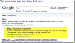 Google caches it (on 4 July) – and displays it in their search for bing – long after the Bing servers are up and operational again (it is now 10 July).