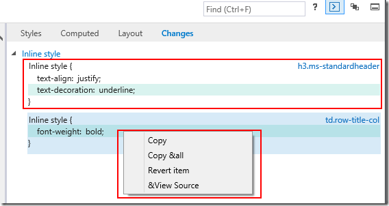 - The DOM Explorer’s “Changes” tab tracks all the individual changes, and you can revert an individual rule, or copy them all and paste to your CSS file.