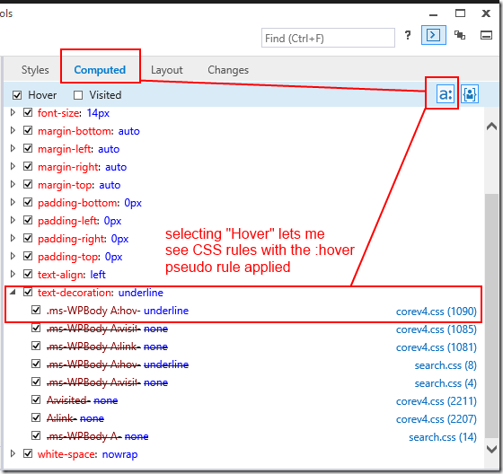 - Now you can apply :hover or :visited and see the effect rule without actually trying to catch your mouse hovering. Haha. Awesome!