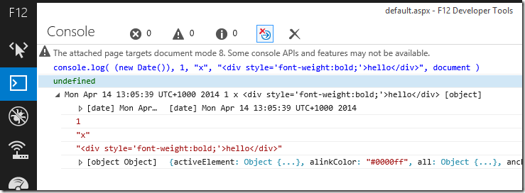 - Chrome and Firefox both were able to log objects and inspect them. IE11 used to just log the [object].tostring which was pretty useless.