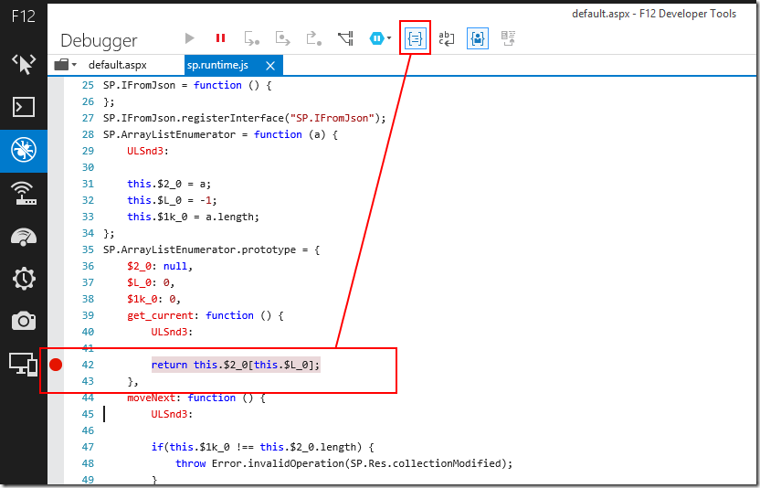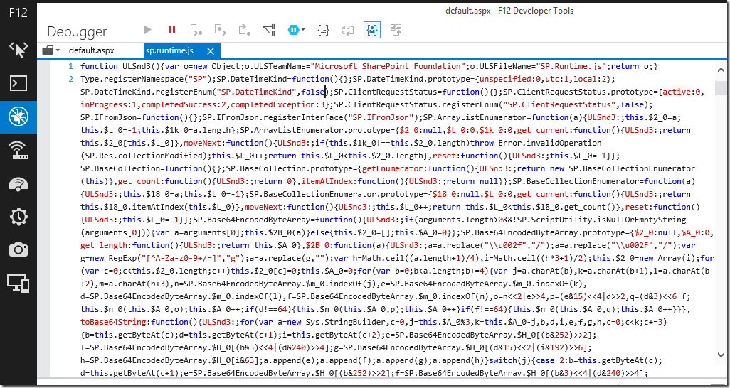 - Hit pretty-print - the sp.runtime.js becomes actually readable, and you can set line-based debugging too!