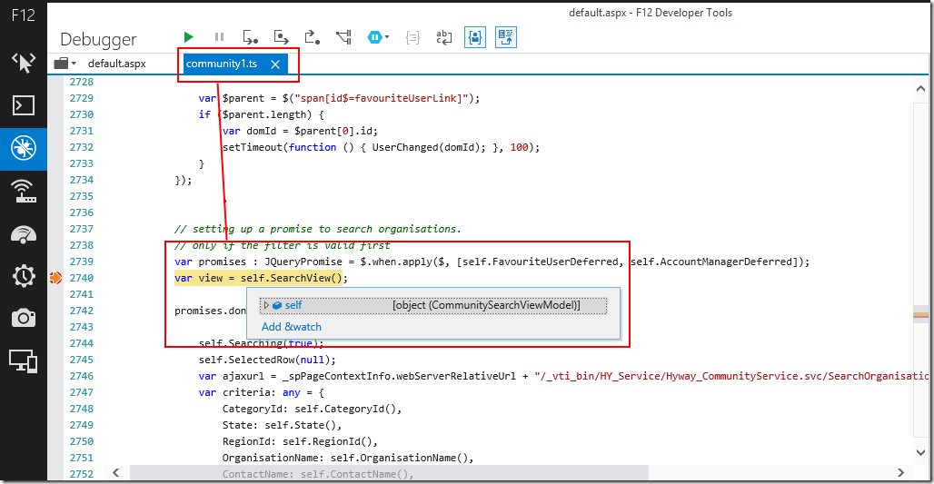 - Now finally we have source map support. Here is me debugging Typescript in IE11