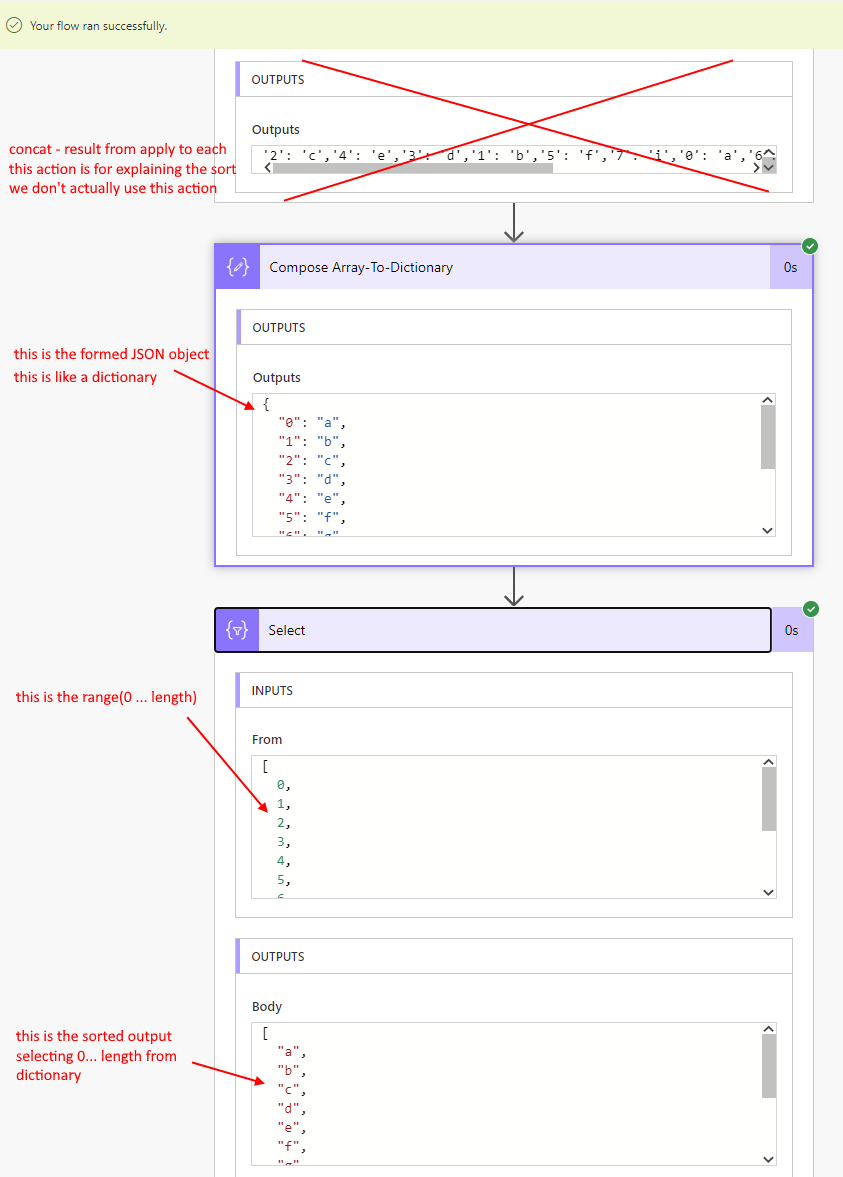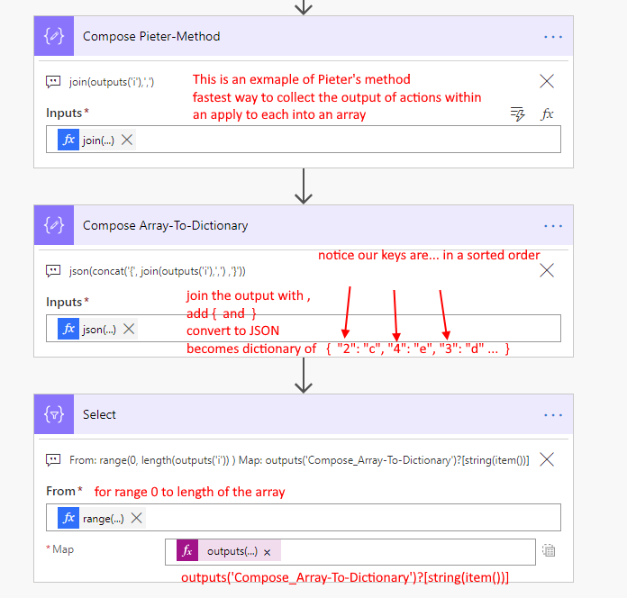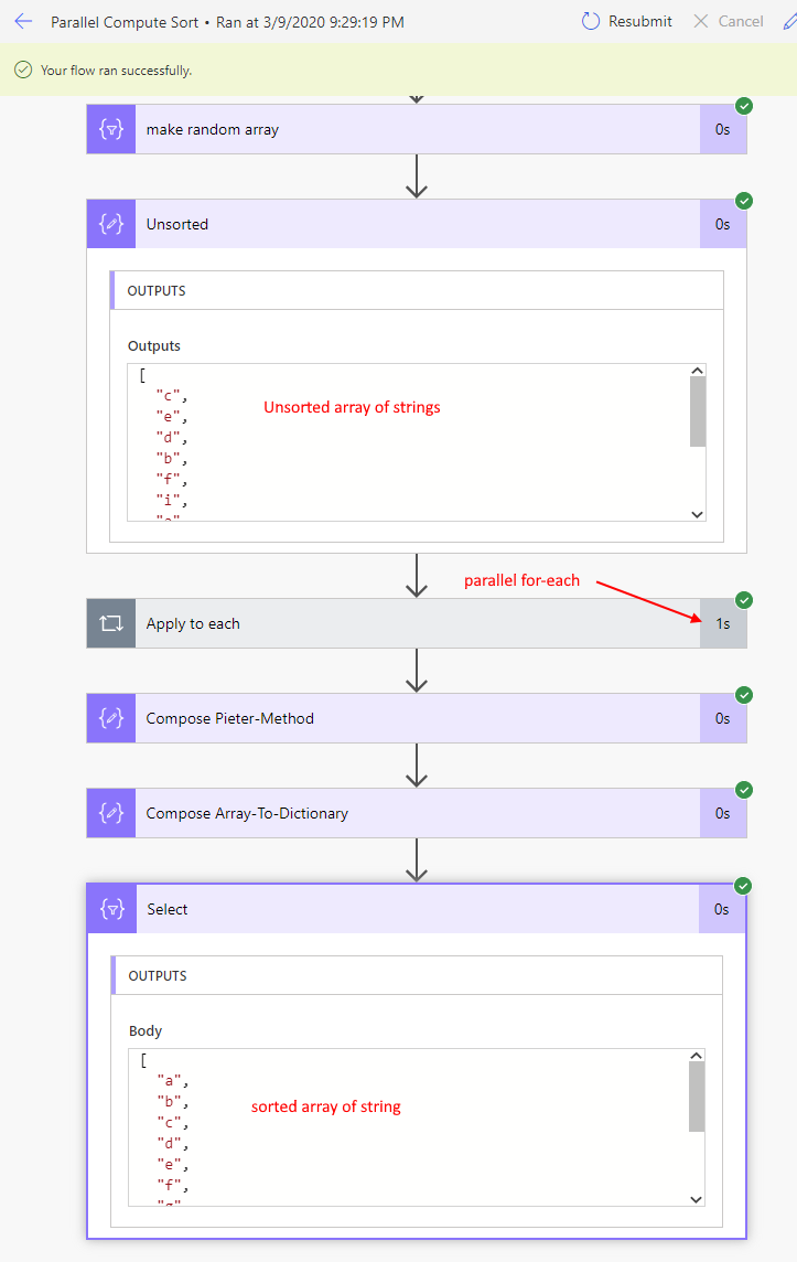 In 2018, I didn’t have many of the patterns I need to make this new 2020 sort method. Firstly, to get results from parallel apply to each, we need Pieter’s Method (Compose apply to each inner output) to fan-in after parallel fan-in.