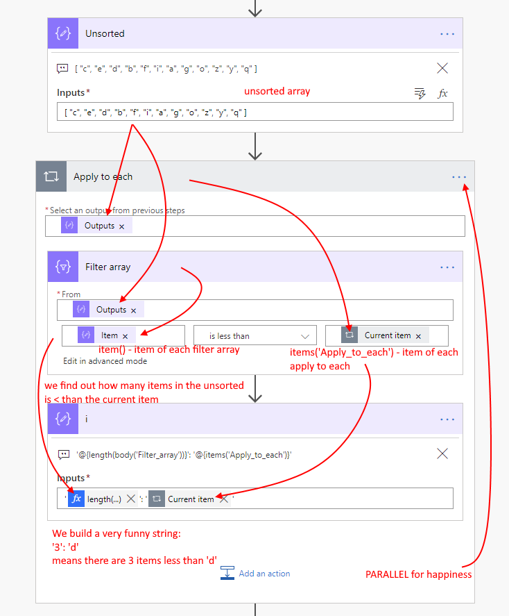 I had written about how to sort with a variable (this is insertion sort) back in 2018 How to implement sort with Microsoft Flow-in-3-actions-within-a-loop