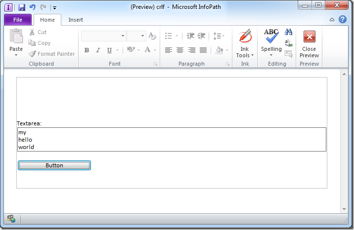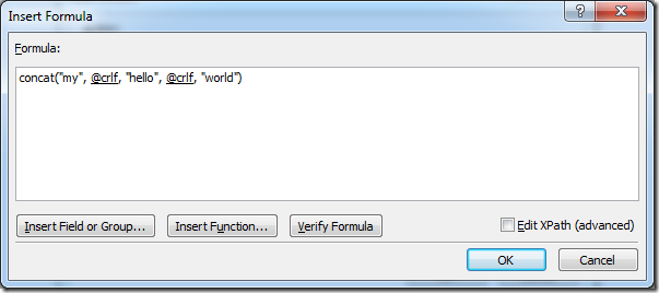 concat(“my”, xdXDocument:GetDOM(“characters”)/lookups/characters/@crlf, “hello”, xdXDocument:GetDOM(“characters”)/lookups/characters/@crlf, “world”)