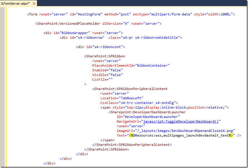 - Copy contents from the OOTB FormServer.aspx file to our custom aspx page
