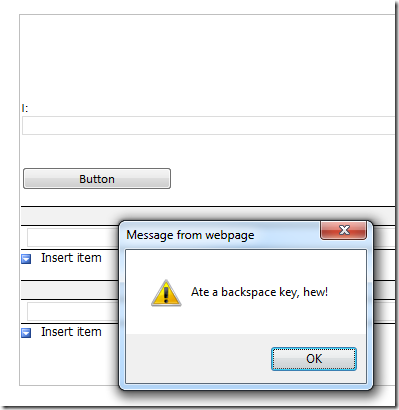 Un-focus from a textbox, so that the focus is now on the main page - and press backspace. Normally, this would trigger Internet Explorer to go back to the previous page in history, but now this event is caught by our JavaScript and cancelled!