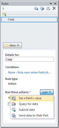 </xsf:rule>15. Save, and close Notepad. Re-open manifest.xsf file using InfoPath Designer