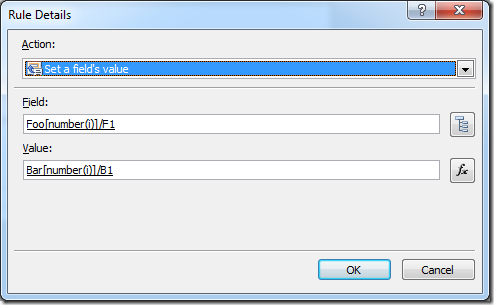 <xsf:assignmentAction targetField=”../my:Foos/my:Foo**[number(../../my:i)]**/my:F1” expression=”../my:Bars/my:Bar[number(../../my:i)]/my:B1”></xsf:assignmentAction>