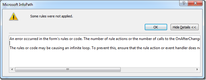 InfoPath is hard coded to only execute 16 rules before throwing the “Infinite Loop” error.