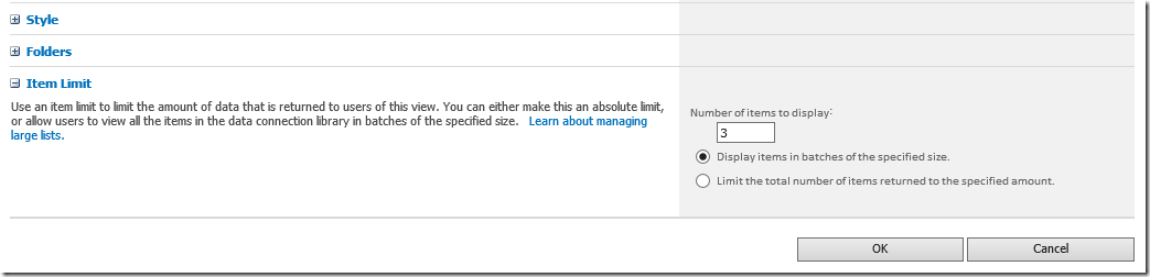 Change the Item Limit in the default view for the Data Connection library in SharePoint.