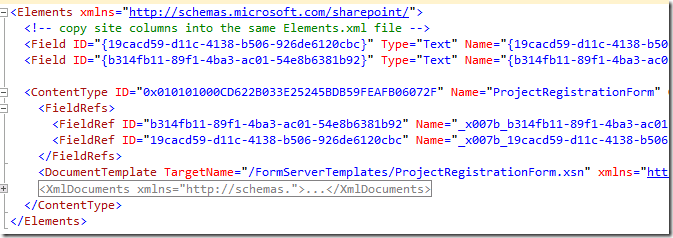 Open the Elements.xml file under the InfoPath content type, and insert the site column definitions above the content type definition.(You’ll see the content type has FieldRef to the exported columns).