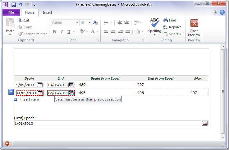 “I am using Infopath2010 and developing a form where there are multiple sections. In each section I have a from date and to date controls.My requirement is to takecare the same date range should not fall in anyother sections.”