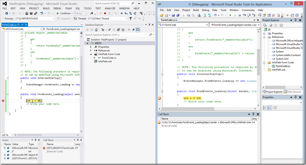 Here is both VS2012 debugging an InfoPath 2013 form, at the same time as VSTO debugging a separate InfoPath 2010 form.