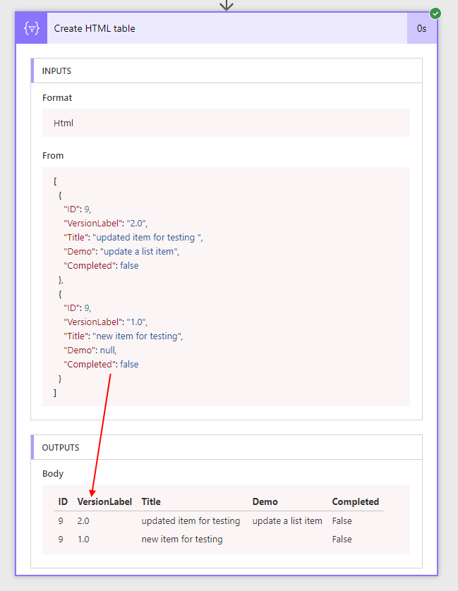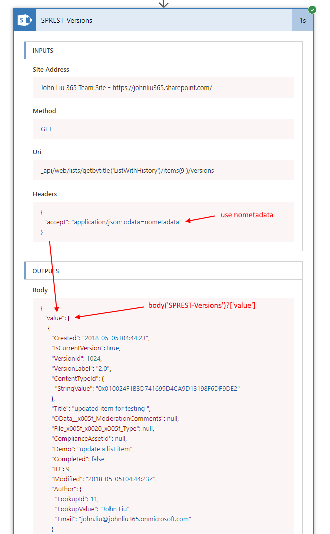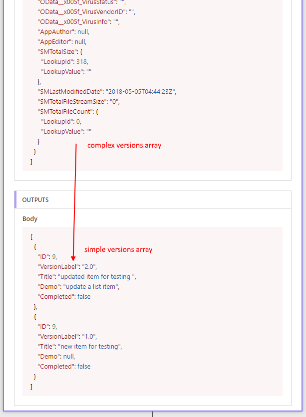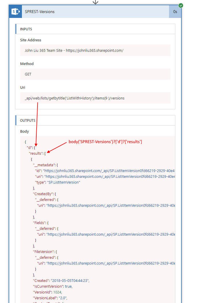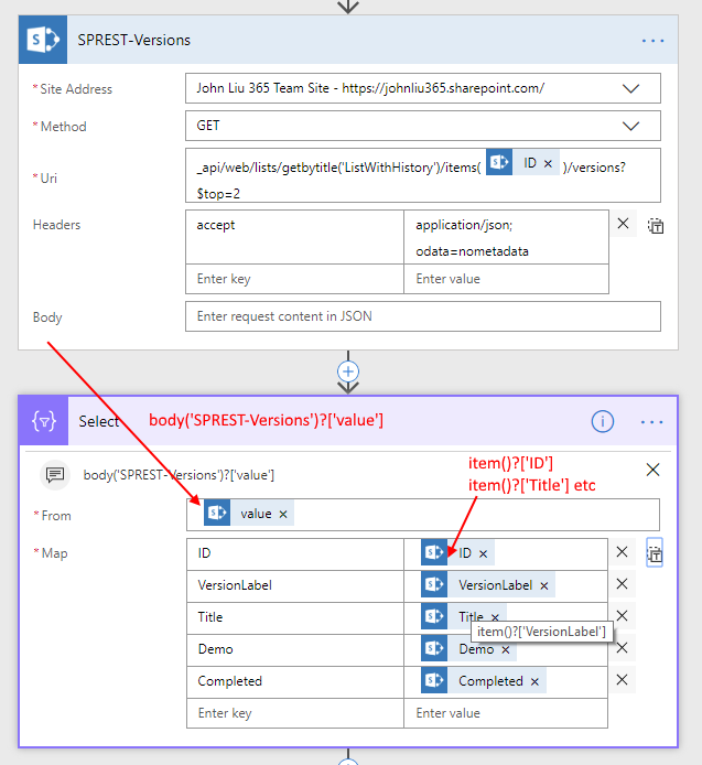 body(‘SelectVersions’)?[0]?[‘Title’]