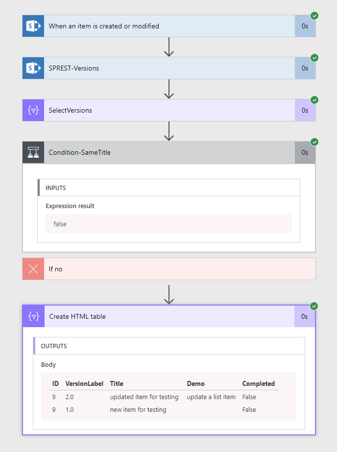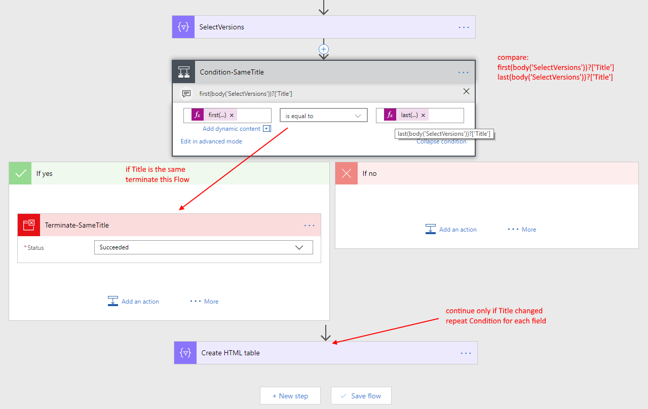 Tip 5 (advanced) - in the SelectVersion step - do not include the VersionLabel then in the comparison step - compare the two JSON objects string(first(body(‘SelectVersions’))) and string(last(body(‘SelectVersions’))) directly. This allows us to check all the fields together.