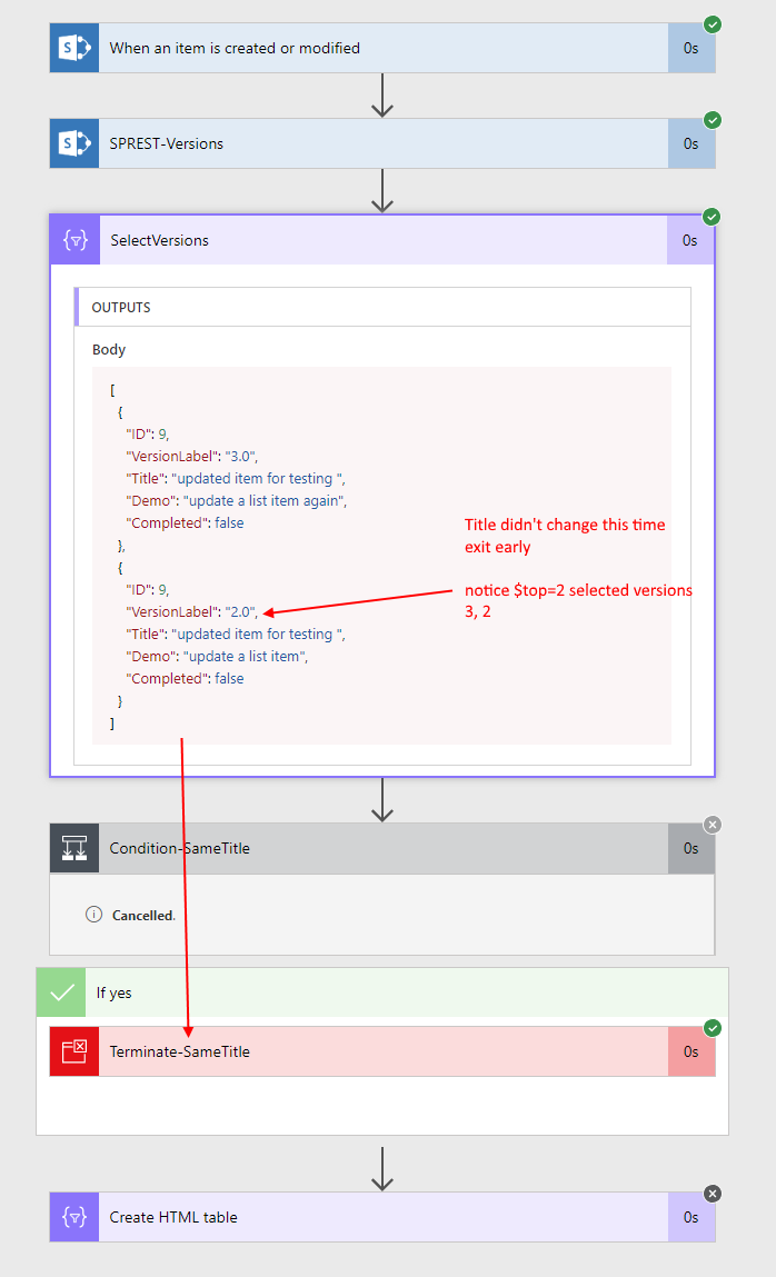 body(‘SelectVersions’)?[1]?[‘Title’]The second row [1] doesn’t exist, but ? will replace the query with null.