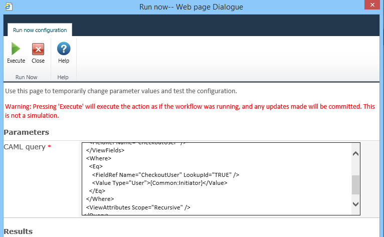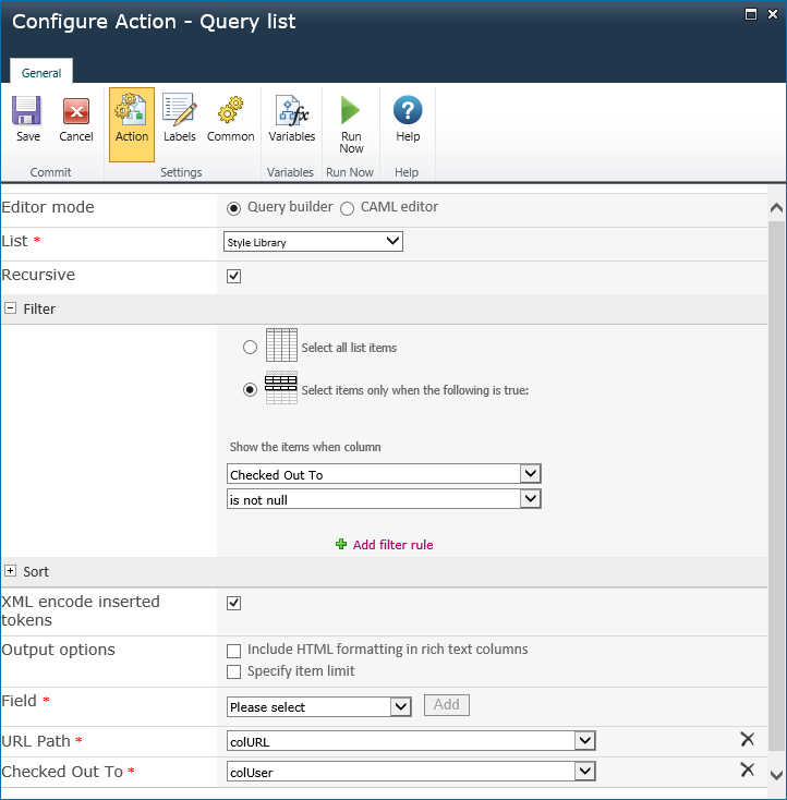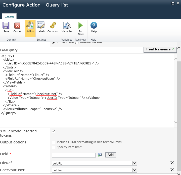 Return to Configure Action. Make the same change to the CAML query.