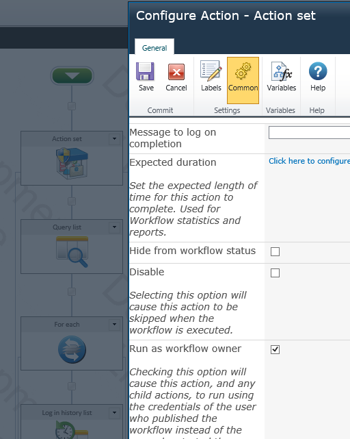 Sometimes, you might want to let a colleague check in your files on your behalf. Nintex let you set up workflow within an Action Set to run as the Workflow Owner.
