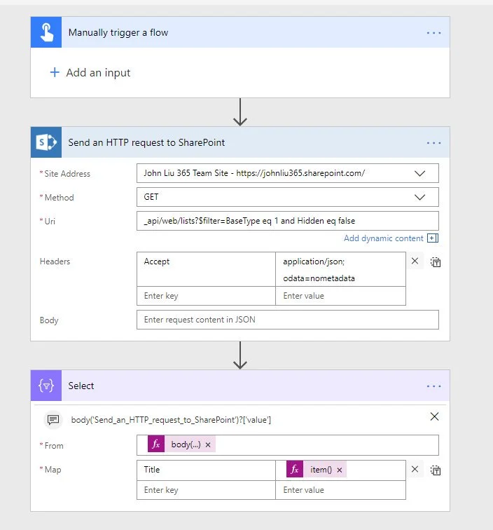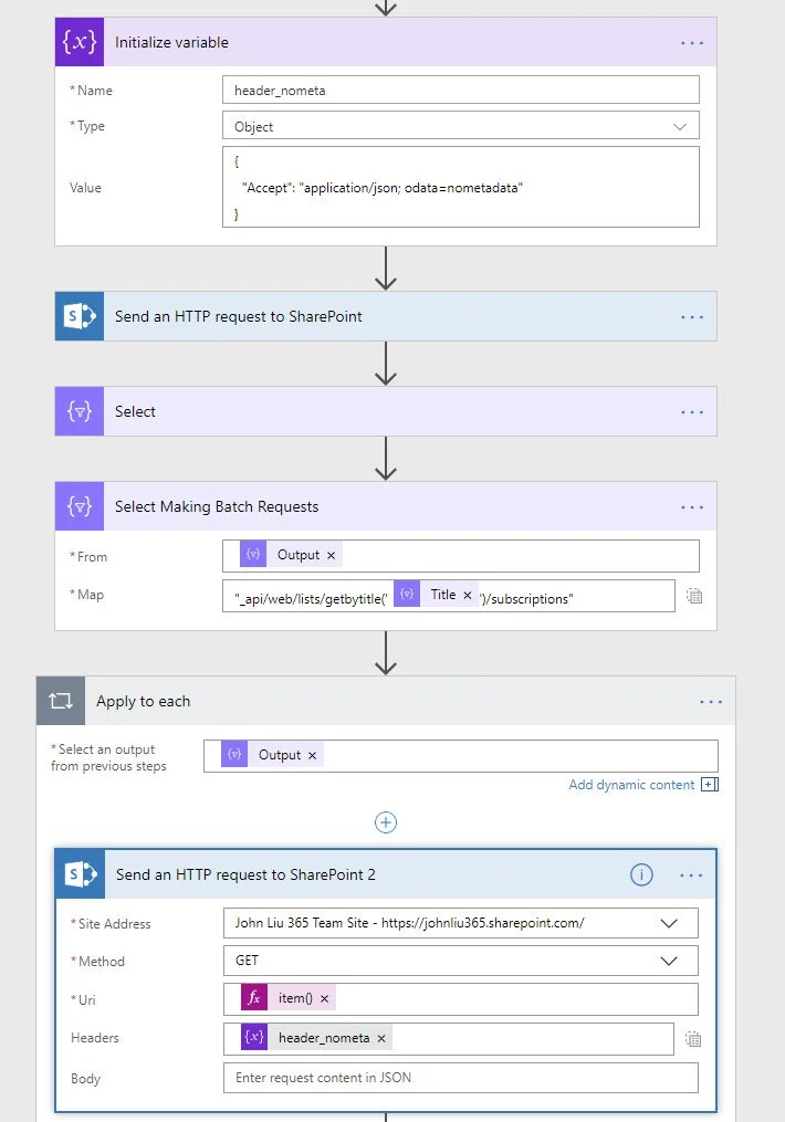 TIP: Because I use odata=nometadata a LOT - I end up putting that header into a header_nometa JSON variable and insert it in every Send HTTP Request action.