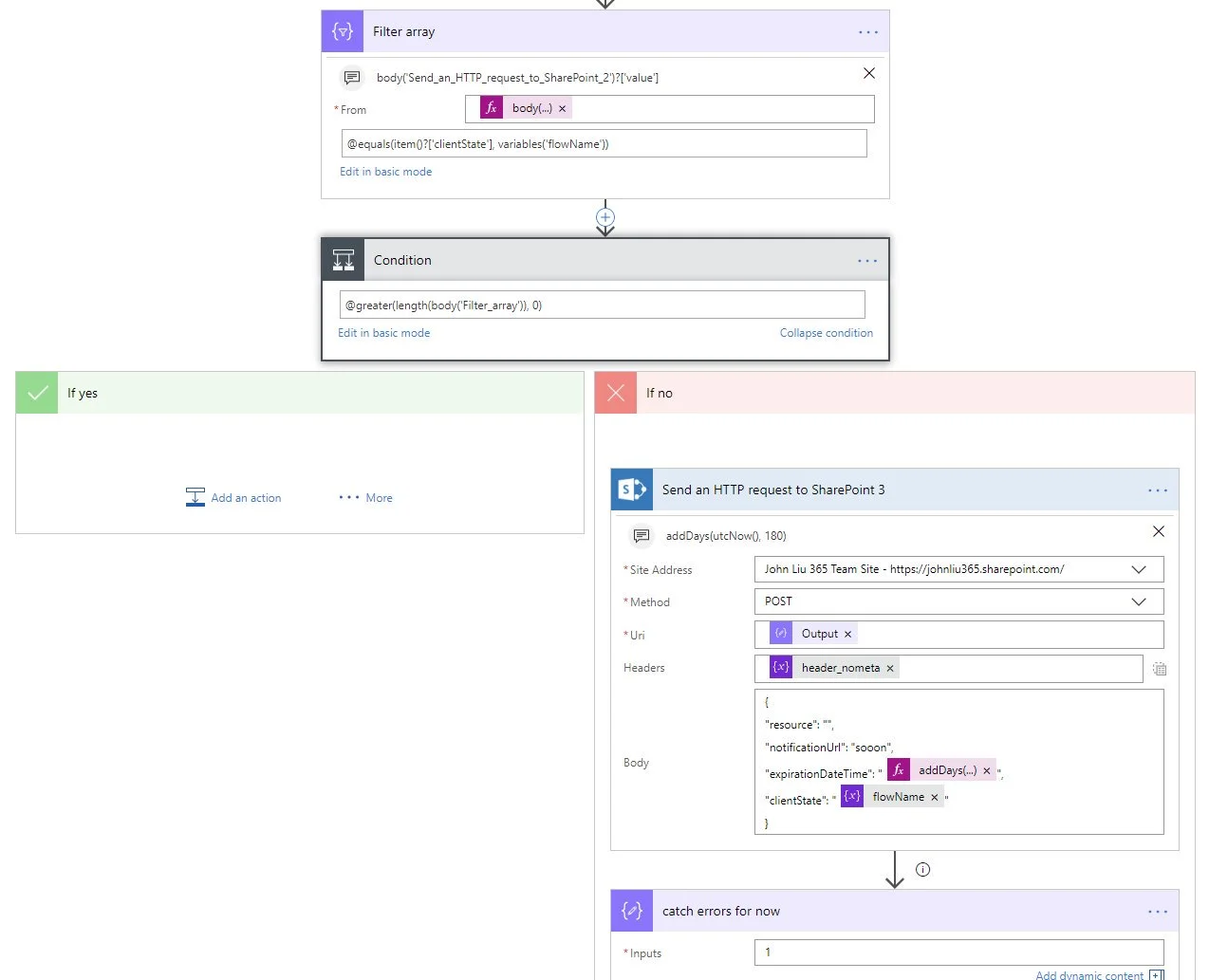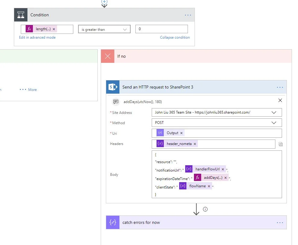 If not, we create one. The check and filter for ClientState makes sure we don’t subscribe the same event handler to the same document library multiple times. It also makes this “scheduler” flow re-run safe. We can pretty much change the trigger to a recurrence trigger that runs as often as you’d like - say daily.
