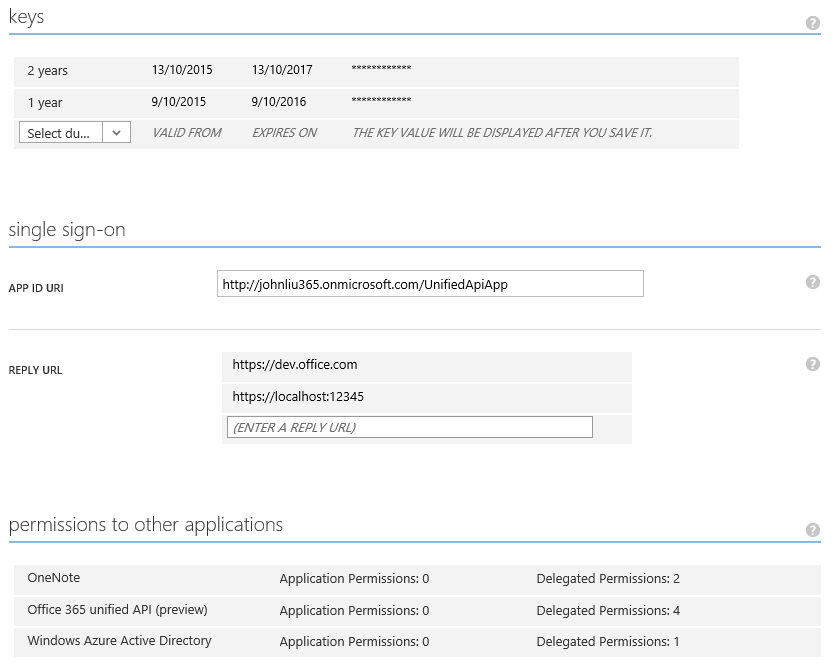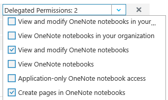 - On this development environment I didn’t have OneNote available in Azure App Permissions. I found out I need to create a OneNote document in Office 365 first and open it with OneNote online. That seems to register that I need OneNote API.