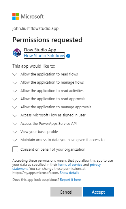 When customers login to Flow Studio App v1.1.45 or later, you will be asked to re-consent due to this additional scope.